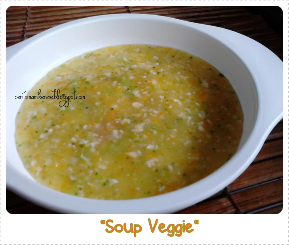 Umur Kenzie sudah 9m+, jadwal makannya mau saya rubah, 3 kali makan padat dan 1-2 kali cemilan. Nah, tadinya kan sarapannya Kenzie makan buah yang dicampur oatmeal atau hanya buah saja sekarang buahnya mau saya jadikan cemilan. Jadi, sarapannya mulai makanan padat. Hari ini saya coba bikin soup veggie. Resepnya saya dapat dari milis MPASI Rumahan tapi udah saya modif sedikit :D